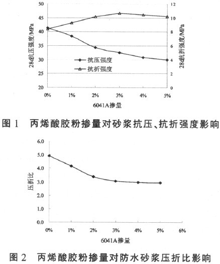 (1)丙烯酸胶粉6041A 掺量超过3%时,防水砂浆压折比可以小于3,抗压强度大于24 MPa,抗折强度大于8.0 MPa。