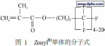 ZonylTM单体为工业级,其分子式如图1所示,碱洗三次后水洗至中性,再用活性炭处理后过滤干燥;甲基丙烯酸甲酯(MMA) 、丙烯酸丁酯(BA) 、甲基丙烯酸2β2羟乙酯(HEMA) 、甲基丙烯酸二甲胺基乙酯(DMAEMA)均为工业级,碱洗至无色后干燥过夜,减压蒸馏后备用;异佛尔酮二异氰酸酯( IPD I) ,工业级;三乙醇胺( TEOA) ,分析纯,真空干燥后备用;3, 5-二甲基吡唑(DMP) 、丁醇(BO ) 、醋酸丁酯(BAC) 、四氢呋喃( THF) 、丁酮、二正丁胺、冰醋酸、盐酸,均为分析纯;偶氮二异丁腈(A IBN) ,化学纯,重结晶后备用.