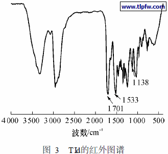 由图2可见, C F的特征峰出现在1 200 cm- 1附近, 1640 cm- 1附近的特征峰归属于C C. 扩链剂三乙醇胺引入可离子化基团,这从树脂在酸化后表现出的良好的水分散性可以得到证明.TId的红外图谱如图3所示.