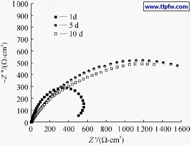 电化学测试用上海辰华仪器公司CH I 750A电化学工作站,采用三电极体系,腐蚀介质为3.5%的NaCl水溶液,以铂电极为辅助电极,饱和甘汞电极为参比电极,样品为工作电极. 样品在浸泡一定时间后测量其交流阻抗谱,选择正弦波电压幅值20mV,频率范围0.1Hz~10 kHz,测试在室温下进行.