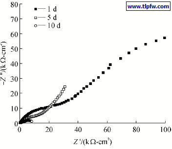 从图中可以看到,普通阴极电泳漆膜在经5天浸泡后,阻抗谱为单容抗弧,同样其等效电路对应于图11,但是其孔隙电阻Rpo远较浸泡1天的普通阴极电泳漆膜小,这时漆膜表面布满红锈. 也就是说,其阻抗谱为单抗容弧是因其在浸泡过程中生成的氧化物阻碍了腐蚀反应的进行而造成的. 普通阴极电泳漆膜浸泡10天后的阻抗谱呈现两个时间常数特征,低频部分出现了明显的Warburg阻抗的特征. 这是由于电荷在电极和电解质之间的传递,使电解质中离子分布不均匀,从而发生扩散过程,即一个与电荷传递过程相继的过程,其效果相当于一个与电荷传递电阻相串联的阻抗[ 14 ] .