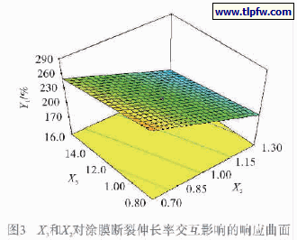 图2 ~ 4 是三维响应曲面图,它们是反映涂料配方参数与涂膜断裂伸长率之间的关系。