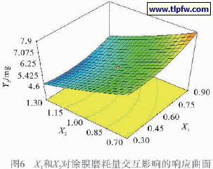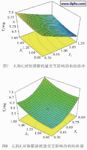 由图6 ~ 8 可知,涂膜磨耗量随X1 增加先减小后增加,这是由于树脂配比直接影响到涂料中基料对填料的粘接强度;涂膜磨耗量随X2 的增加使涂膜交联密度增加而减少;当X3 增大时,涂层的磨耗量下降,涂层的耐磨性能提高,但当颜基比增大到一定程度时,涂层磨耗量开始缓慢增加,耐磨性能下降,这说明一定的颜填料有利于增加涂膜强度而提高耐磨性能,当颜填料比例较大时,致使基料的黏结作用下降,颜填料易于脱落,使磨耗量增加,涂膜的耐磨性能下降。