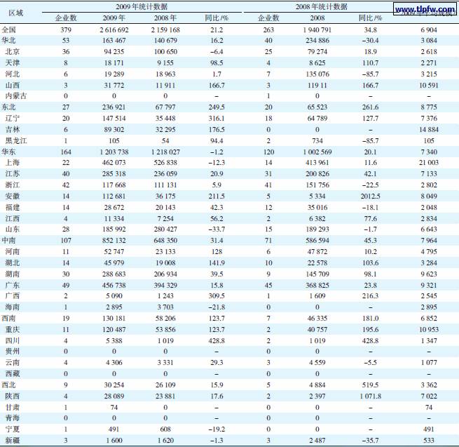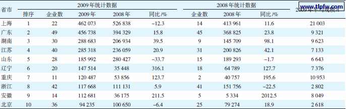 按国家统计局2009 年公布的统计数据,2009 年我国建筑涂料产量为261.7 万t,2008 年为215.9 万t,同比增加21.2%。各省市统计产量见表3。而按国家统计局2008 年公布的统计数据,2008 年我国建筑涂料产量是194.1 万t,2009 年同比就增加了34.8%。分析其原因,差别主要是统计的企业数和企业不同所致。2008 年统计企业数263 家,其中内蒙古1 家企业实际没有统计数据。2009 年统计企业数379 家,统计企业数多了44%。这一方面使统计数据更接近实际生产量,另一方面使统计数据的可比性变差,难以确定实际年增长率。