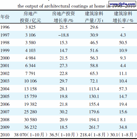 我国正处于城市化进程中,有力推动了房地产业的发展,每年约4 万亿的房地产投资,近30 亿m2的竣工建筑面积,使得建筑涂料市场需求强劲。我国1996~2010 年房地产投资和建筑涂料产量关系如表1所示。