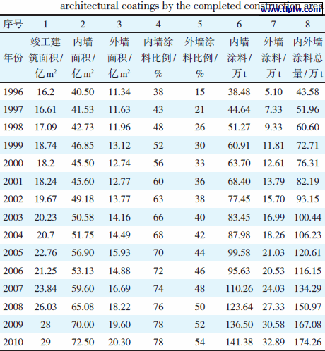 表2 以竣工建筑面积估算内外墙建筑涂料需求量