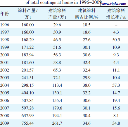 我国1996~2009 年建筑涂料产量和占涂料比例见表5。