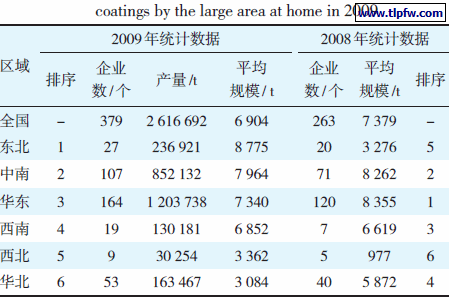 根据国家统计局公布的统计产量和企业数,我国2009 年建筑涂料平均产量按大区排序见表6。为了便于比较,将2008 年平均规模也列于该表。2009 年,379家建筑涂料企业共生产建筑涂料2 616 692 t,全国平均规模为6 904 t。产量最高的地区是东北,8 775 t ;其次是中南,7 964 t ;第三是华东,7 340 t。其中东北地区产量中含有较多外墙外保温黏结砂浆和抹面砂浆类产品。