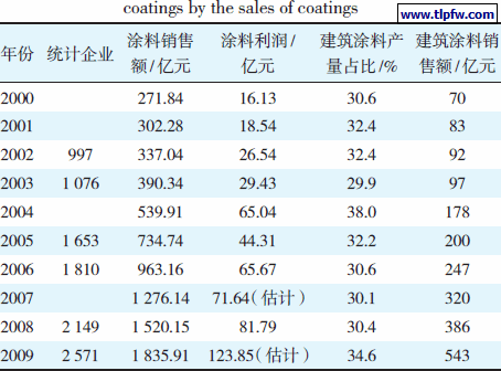 2000~2009 年以涂料销售额估计的建筑涂料销售额见表8。估计值以建筑涂料销售额所占比例低于建筑涂料产量所占比例5%计,即估计建筑涂料销售额= 涂料销售额×(建筑涂料产量占比-5)/100。