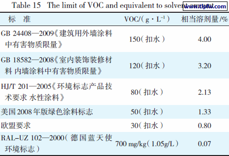 表15 不同标准对VOC的限量值和相当于溶剂加量