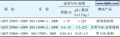 由表15 可见:与欧美比较,我国建筑涂料对VOC 的要求还是比较宽松的。不同涂料VOC 的测试方法见表16。只有按GB/T 23984—2009 或ISO17895 :2005 测试,才能确定零VOC 涂料。用GB/T23986—2009 或ISO 11890-2 :2000 不能确定是否是零VOC 涂料,因为其测试精度不够。