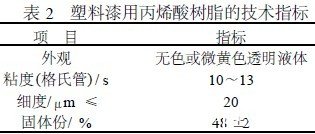 塑料漆用丙烯酸树脂的技术指标见表2 。