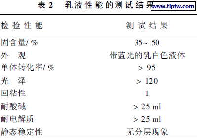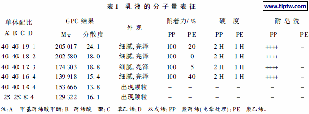 从实验结果得知, 当重均分子量为130 000~250 000, 分散度为15~ 18, 甲基丙烯酸甲酯%丙烯酸丁酯40%40, 苯乙烯含量16%~ 19% , 双戊烯含量1%~ 4% 时, 合成出的乳液成膜性最好, 附着力最强。