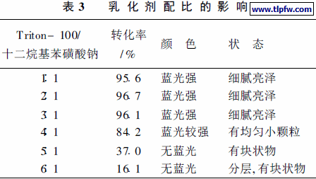 可见, 两种乳化剂Triton- 100 与十二烷基苯磺酸钠配比为1%1~ 3%1, 2%1 时为最佳, 此时不但乳液状态好, 转化率也最高。