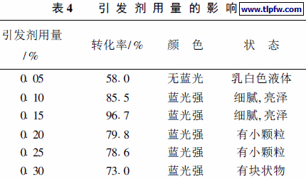 引发剂是乳液聚合配方中最重要的组分之一, 其用量会直接影响乳液的产量和质量, 在其他条件不变的情况下, 单独改变引发剂K2S2O8 的用量, 其结果见表4。