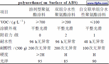 表1 水性聚氨酯涂料与溶剂型聚氨酯涂料的对比(ABS表面)