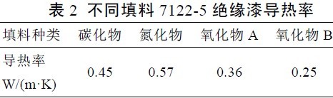 表2 是几种填料经过表面处理后在含量为30%的导热率,由此可以说明我们在绝缘漆中加入无机填料对提高绝缘漆的导热率是可行的[5]。