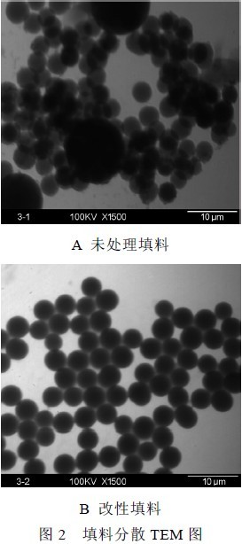 图2 为硅粉含量在25%时的TEM 分析图。由图2 中可以看出,图2(A)中填料在树脂基体中出现了团聚现象,图2(B) 填料改性后的分散性有很大程度的提高,原因是硅粉表面和硅烷偶联剂发生了反应,填料表面在改性后由亲水性变为亲油性,表面能大大降低,在改性后比改性前更容易分散在有机介质中,表现出在树脂基体中具有良好的分散[6]。