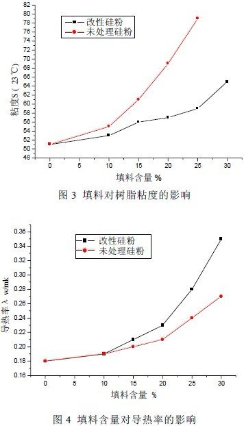 图3 中数据采用7122-5 树脂。 由图中可以看出,由于填料出现团聚现象,未经处理的填料对粘度影响较大。固液悬浮体的粘度与颗粒表面和液体润湿亲和作用有关,一般温度条件下,若固液间亲和作用强,则粘度低;若亲和作用弱,则粘度高。表面改性的方式有:偶联剂的表面处理和填料表面共聚接枝等。与华中科技大学已经开展了纳米填料改性以及分散工艺的合作。目前我们采用较易实现的硅烷偶联剂的表面改性方式。因为硅烷偶联剂是一种具有特殊结构的有机硅化合物。在它的分子中,同时具有能与无机材料结合的反应性基团和与有机材料 ( 如合成树脂等 )结合的反应性基团。所以经过表面改性后的填料亲油性较强,加入树脂中,树脂粘度变化很缓慢。在填充量为30%时,粘度为65 s,仍能满足使用工艺要求。关于填料表面共聚接枝的改性方法、填料分散工艺,以及如何降低更大添加量下的粘度有待进一步研究。填料的添加量与填料表面的改性有很大关系,能否在更大的添加量下不改变树脂的粘度有待进一步的研究[7]。由图4 中可以看出,经过表面改性的填料含量从20%开始,导热率有显著提高,这说明在填料含量为20%时,已经形成了导热网络结构,热流可以快速传播,当填料含量为30%时,导热率可达到0.35 W/(m·K)。由于未经处理的填料在树脂中不能均匀分散,有的颗粒可能被树脂包覆,不能形成互穿网络结构,所以导热率变化不明显。填料的添加量与填料表面的改性有很大关系,能否在更大的添加量下不改变树脂的粘度有待进一步的研究。