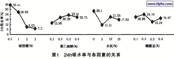 ( 2) 硬脂酸含量为3%; 水泥的添加量取总量的5%; 聚乙烯醇的含量取值为0.1%; 硼酸盐取值为0.3%时防水效果为最佳。
