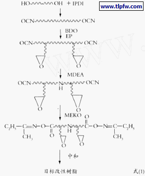在装有搅拌器、温度计的三口瓶中,加入聚醚二元醇,在90 ℃, 0199 ×105 Pa下真空处理1 h,加入异佛尔酮二异氰酸酯( IPD I) , 80 ℃反应2 h后,加入1, 4 – 丁二醇(BDO)和环氧树脂反应2 h,降温至40 ℃加入N – 甲基二己醇胺(MDEA) ,再反应2 h,温度升到60 ℃封端,最后降温到40 ℃以下加入酸中和,得阳离子型环氧改性聚氨酯树脂。其反应原理如式(1) 。