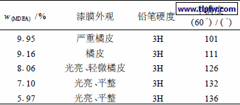 根据对漆膜性能的评价,在保证乳液稳定存在的情况下,应尽量降低MDEA 的含量以保证漆膜的综合性能满足使用要求。