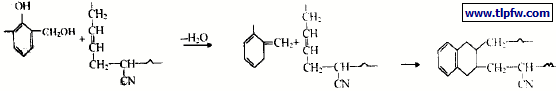 固化剂中还含有苯酚- 甲醛组分, 对此固化反应有强烈的促进作用[ 3 ]。固化剂固化环氧树脂是放热反应, 放出的热量足以促进钡酚醛树脂与丁腈- 40, 酚醛树脂与环氧树脂及酚醛树脂和环氧树脂与有机硅偶联剂之间发生化学反应, 形成共聚交联网络结构。酚醛树脂与丁腈- 40 的交联反应机理可用Hu ltzch 提出的氧杂萘满理论[ 4 ]进行解释: