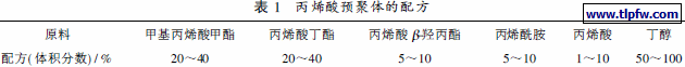 选择丙烯酸ß-羟丙酯, 丙烯酰胺为活性单体, 主要用途在于提高漆膜的交联能力, 其用量直接影响漆膜性能; 用量太少, 不能保证预聚体分子链有足够反应能力; 用量太大, 交联程度增大, 最终导致漆膜