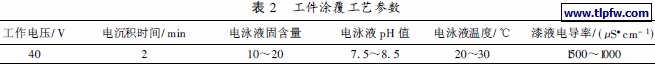 混合树脂中, 分别加入颜料, 填料; 用高速分散机分散, 经砂磨机研磨, 调制成色漆树脂. 加入适量的中和剂, 调节漆液pH 值至控制点; 再加入稀释剂. 同时, 加入少量表面活性剂, 配成一定浓度的电泳浆液. 将表面处理后的工件, 放在电泳槽上涂饰,选择适当的工艺参数[ 4] , 以获取满意的涂覆质量.