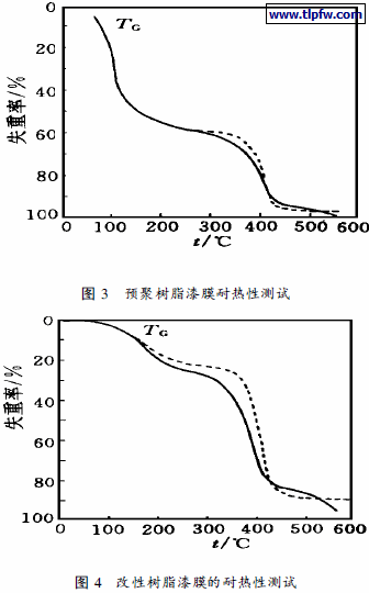 用T GD-5000型差热微天平联用分析仪, 程序升温, 对交联树脂和预聚树脂的耐热性进行测试, 结果如图3, 4. 显然, 树脂的耐热性能已得到大大提高; 交联前后树脂失重率30% 的耐热温度,由原来的120 ℃提高到340 ℃.