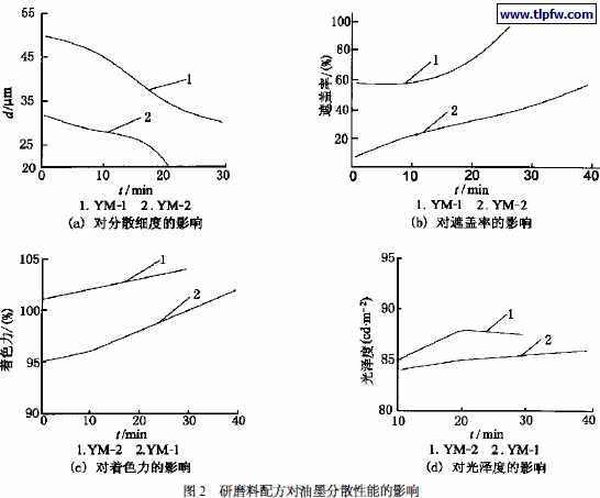 图2 反映了高颜料和低颜料质量分数配方对油墨分散细度、遮盖力、着色力及60 ℃光泽的影响, 显然, 水墨的分散性能与其研磨料的组成密切相关。
