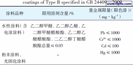 GB 24409—2009《汽车涂料中有害物质限量》标准是在2009 年9 月30 日颁布、2010 年6 月1 日起实施的。它的颁布和实施对于汽车制造行业和汽车涂料生产企业均产生了巨大的影响。该标准适用于除腻子、特殊功能性涂料以外的各类汽车涂料,包括乘用车、商用车、挂车、轿车及列车用原厂涂料、修补涂料和零部件涂料。而该标准不适用的特殊功能性涂料指聚丙烯底材附着力促进剂(PP)、主要功能为防(抗)石击性的涂料[不含辅助防(抗)石击功能的涂料]、消除新旧涂膜接合处痕迹的辅助材料(接驳口)等。该标准将汽车涂料分为2 类:A 类为溶剂型涂料,包括热塑性、单组分交联型和双组分交联型涂料;B 类为水性涂料(含电泳涂料)、粉末涂料和光固化涂料。其中A 类和B 类汽车涂料的有害物质限量应分别符合表4 和表5 的要求。