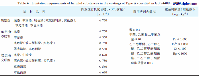 表4 GB 24409—2009 规定的 A 类涂料中有害物质限量的要求