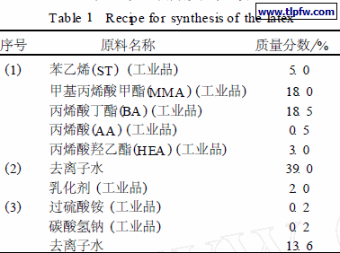 参照文献[ 7 ]的方法合成。树脂的相对分子质量以聚苯乙烯为标样, 采用德国产W aters1515 凝胶渗透色谱仪测定。AA 和HEA 的质量分数分别为6% 和10% , T g= 10 ℃(Fox 公式计算值) ,M w