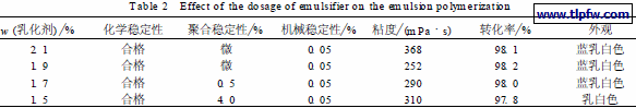 采用O P210 和十二烷基联苯醚二磺酸钠复合乳化剂。考查该乳化剂的用量对乳液聚合的影响, 结果见表2。随着乳化剂用量减少, 乳液的蓝光有所降低, 聚合稳定性下降。当质量分数为1. 5 % 时, 聚合过程中出现少量结块。乳化剂用量过多会影响到涂膜的耐水性、并更易产生气泡。综合考虑, 确定乳化剂质量分数为1. 7%。