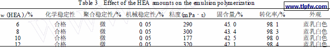 表3 丙烯酸羟乙酯用量对乳液聚合的影响