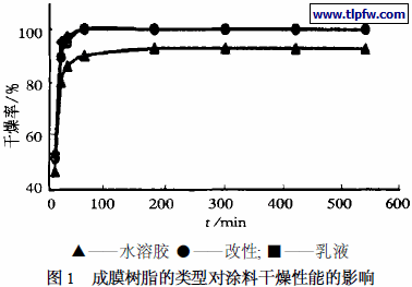 干燥率: 将漆涂刷在干的标准马口铁片上后立即放于JY2502 电子天平(上海精密科学仪器有限公司产) 上跟踪测定挥发量(温度23~ 27 ℃,相对湿度55%~ 60% ) , 该挥发量与总挥发量(湿涂膜在105 ℃烘至恒重时的挥发量) 之比称为干燥率;