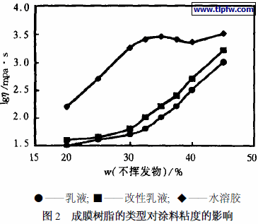 ( 2) 和氨基丙烯酸水溶胶漆相比, 改性氨基丙烯酸乳胶漆光泽度和硬度较低, 但涂膜干燥较快, 不易爆泡, 在固体质量分数为30 %~ 40 % 范围内不存在粘度反常现象, 因而施工时固含量高,施工性能良好。该漆可用于卷材及罐头盒等。