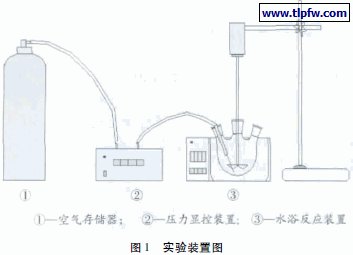 涂料用微胶嚢乳液的制备: 配制一定浓度的苯乙烯马来酸酐乳液,调节pH,恒温60 ℃,通入空气50 min,加入三聚氰胺预聚体进行搅拌( 转速1 200 r /min) 2 h,出料。其基本工艺流程为: 原料[空气( 或二氧化碳气体) 、水、苯乙烯马来酸酐]→乳化→调节pH→加入三聚氰胺预聚体→缩聚交联→微胶囊乳液。实验装置见图1。