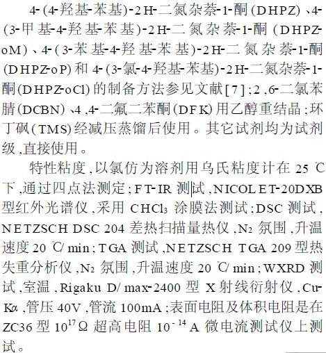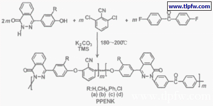 聚芳醚酮是一类具有优异耐热性、耐疲劳性、耐辐射性、化学稳定性、阻燃性和尺寸稳定性等性能的特种工程塑料,被广泛应用于电子电气、航空航天和汽车工业等领域[1 ,2 ] 。然而大多数聚芳醚酮品种,由于分子链的刚性、结晶性等原因,造成分子链的紧密堆砌,导致其溶解性较差,只能采用加热成型的方法,加工方式单一,限制了它们的应用[ 3 ] 。研究表明,将扭曲非共平面的杂萘联苯结构引入到聚合物主链中可以改善聚合物的溶解性,同时赋予聚合物优异的耐热性[4~6 ] 。本课题组已经成功开发了既耐高温( Tg = 263 ℃) 又可溶解的含杂萘联苯结构聚芳醚酮高性能树脂[7~9 ] 。聚芳醚腈( PAEN) 是一类含有氰基侧基的高性能工程塑料[10 ,11 ] 。由于强极性氰基侧基( —CN) 的引入,一方面增加了分子链间的偶极2偶极作用,有利于在获得较高的耐热性能和机械强度的同时,增强树脂基体的附着力;另一方面,氰基作为一个潜在的交联点可以形成具有更高耐热性能的网络结构[ 12 ,13 ] 。在原有工作的基础上,将杂萘联苯结构和氰侧基引入到聚芳醚酮主链中制备可溶性聚芳醚腈酮新品种,该类树脂可望同时具有聚芳醚腈和聚芳醚酮的优点。因此以4 种含杂萘联苯结构的类双酚单体与2 ,6-二氯苯腈、4 ,4’- 二氟酮为原料,成功地合成了一系列新型既耐高温又可溶解的含杂萘联苯结构聚芳醚腈酮,同时对所得聚合物的热性能和溶解性能进行了研究,并进行了该类聚芳醚腈酮在绝缘漆方面的应用研究。