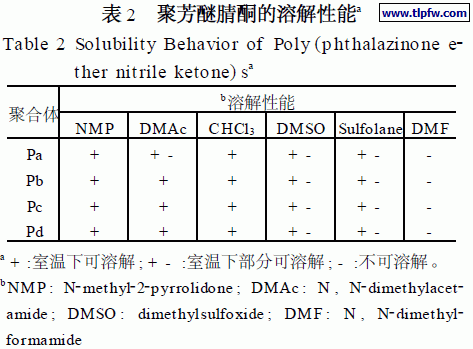 通过X 射线衍射测试表明聚合物均具有无定型结构,这是因为在聚合物主链中引入非对称性的杂萘联苯结构,破坏了聚合物大分子链结构对称性;同时,体积较大的杂萘联苯结构具有扭曲非共平面的立体构象,降低了分子链间作用力和结晶度。对聚合物进行的溶解性能测试也证明了上述结论,如表2 可知,所合成的聚芳醚腈酮可在室温下溶解于氯仿、N-甲基-2-吡咯烷酮和N ,N-二甲基乙酰胺,加热条件下溶解于二甲基亚砜和环丁砜等极性非质子溶剂中。将聚芳醚腈酮溶解于NMP 配制成聚合物溶液,通过浇铸成膜的方法可制成透明的韧性薄膜,表明该类聚合物具有良好加工和应用前景。