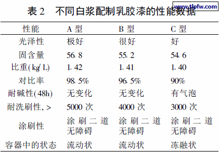将由表1 配制的三种白浆配制成外墙乳胶漆,测定性能参数, 具体数据如表2。