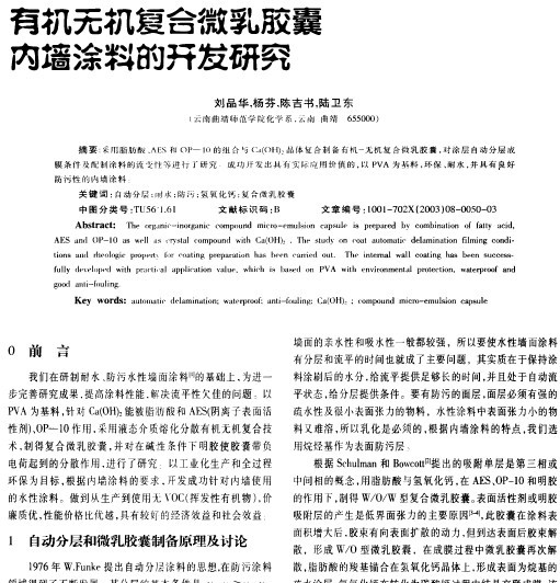 有机无机复合微乳胶囊内墙涂料的开发研究 admin 6 2 月, 2012 0:00 阅读(89) 有机无机复合微乳胶囊内墙涂料的开发研究 刘品华,杨芬,陈吉书,陆卫东 (云南曲靖师范学院化学系,云南曲靖655000) 下载: http://www.ctdisk.com/file… 有机无机复合微乳胶囊内墙涂料的开发研究 刘品华,杨芬,陈吉书,陆卫东 (云南曲靖师范学院化学系,云南曲靖655000) 下载: http://www.ctdisk.com/file/4511293 Post Views: 237