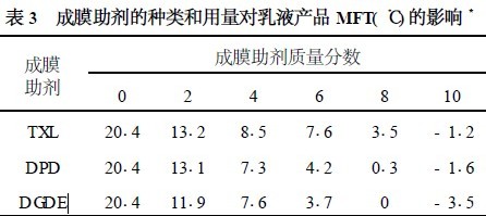 表3 列出了3 种成膜助剂和用量对乳液产品MFT 的影响。