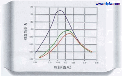 图6中的曲线是用很稀的系统,以理论推导出的,曲线表明R型二氧化钛对蓝色、绿色和红色光线的相对散射能力为粒子大小的函数。在0.2微米处,各波长光线散射的总和就增至最大。当粒子增加至0.25和0.30微米之间时,蓝色光线的散射迅速减少,但绿色和红色光线的散射却相对地不变。在0.15微米处对应于蓝色光线的最大散射,光谱中红和绿范围内的光线散射就显著下降。
