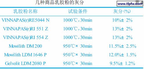 如所熟知,乳胶粉是在聚合物乳液的基础上加工得到的,即通过乳液聚合得到聚合物乳液后,再进行进一步的干燥而得到乳胶粉。无疑,仅从生产消耗的能源、设备投资等来说,乳胶粉的生产成本就要比聚合物乳液的高得多,这是二者成本相差的主要原因。从市场上两种商品的价格比较则能够更清楚:聚合物乳液的市场价格为9200 元/ 吨,其固体含量为55.5%,若将固体分中的其他成分忽略不计,折合成固体聚合物的价格为:9200÷0.555=16577 元,直接比较其市场价格仅为乳胶粉的一半。实际上远不止于此。根据一些商品说明书的介绍(表4),乳胶粉在1000℃高温灼烧后,尚有10%左右的灰分(据说是防粘连剂)。有文献说明这类防粘连剂是滑石粉或者重质碳酸钙[3]。若防粘连剂是滑石粉,则滑石粉的分子式为3MgO·4SiO2·H2O,水分的含量为约5%,乳胶粉中有10.5%是滑石粉;同理可计算出若防粘连剂是重质碳酸钙的高温分解残留物CaO,则乳胶粉中有17.9 是重质碳酸钙。两种防粘连剂情况下,乳胶粉中聚合物组分的价格分别为33 元/ 公斤÷(1- 0.105)=36.87 元和33元/ 公斤÷(1- 0.179)=40.19 元。另一方面,由于乳胶粉中防粘连剂的使用,使得单组分粉状腻子中的乳胶粉用量要比双组分腻子中聚合物乳液是用量(以固体分计)高。同时,通过上面的分析可以看出,使用乳胶粉配制单组分粉状腻子,乳胶粉的成本要比双组分腻子中聚合物乳液的成本高得多。在保持性能基本相同的情况下,粉状腻子的配制成本要比双组分腻子高出2 倍多。