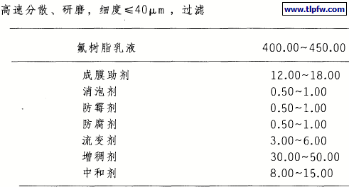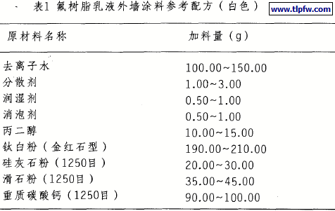 氟树脂乳液, 自制;金红石型钛白粉、硅灰石粉、重质碳酸钙、滑石粉,均为市售;各种涂料专用助剂,均为市售。