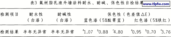 经国家涂料质量监督检验中心和国家化学建筑材料测试中心检验,氟树脂乳液外墙涂料达到中华人民共和国国家标准GB/T9755—2001《合成树脂乳液外墙涂料》中规定的优等品的技术指标要求。从氟树脂乳液外墙涂料性能检测结果(表2)可以看出,它的耐沾污性、耐氟树脂乳液外墙涂料的制造、性能评价及其应用洗刷性、耐人工老化性十分突出。另外,通过自检发现,该涂料的耐水、耐碱性,保色性十分优异(表3)。所有这些都是由于氟的电负性高,原子半径小, 极化率小, 形成的C—F键键长短,键能高,使得氟树脂中的氟原子不但与碳原子结合牢固,而且在碳链骨架外层排列十分紧密, 有效的防止了碳原子和碳链的暴露,从而赋予该涂料上述优异的性能。