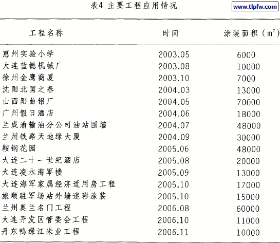 氟树脂乳液外墙涂料的施工配套通常为:基材一平底腻子一光面腻子一水性氟碳底漆(一道)一氟树脂乳液外墙涂料(二道)。为取得更佳效果也可在基材和腻子之间增加一道封闭底漆。氟树脂乳液外墙涂料自2003年开始, 已在东北、华北、华南等全国范围内进行了广泛应用(见表4), 涂装面积达到两百万平方米以上, 工程总体效果良好, 受到用户的好评, 正逐渐被市场认同,预计今后会有更大的突破。