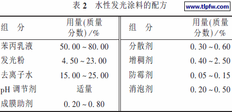 试验配方综合考虑了涂料的各项性能指标要能满足内墙涂料的国家标准要求,涂料的发光时间和发光亮度应达到一定的要求,环境友好、价格合理等因素。拟采用不同参量的长余辉发光粉进行试验,再基于发光特性亮度)、物理机械性能、成本等,确定了水性发光涂料的配方(见表2).